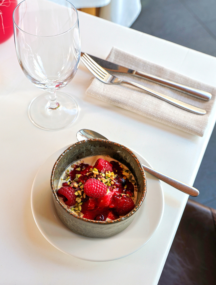 sorbet z malin, palona biała czekolada, owoce, beza