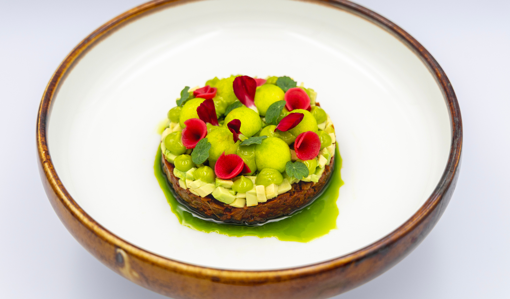 puree z groszku, sos szpinakowy, zielone warzywa, piklowana rzodkiewka, olej koperkowy