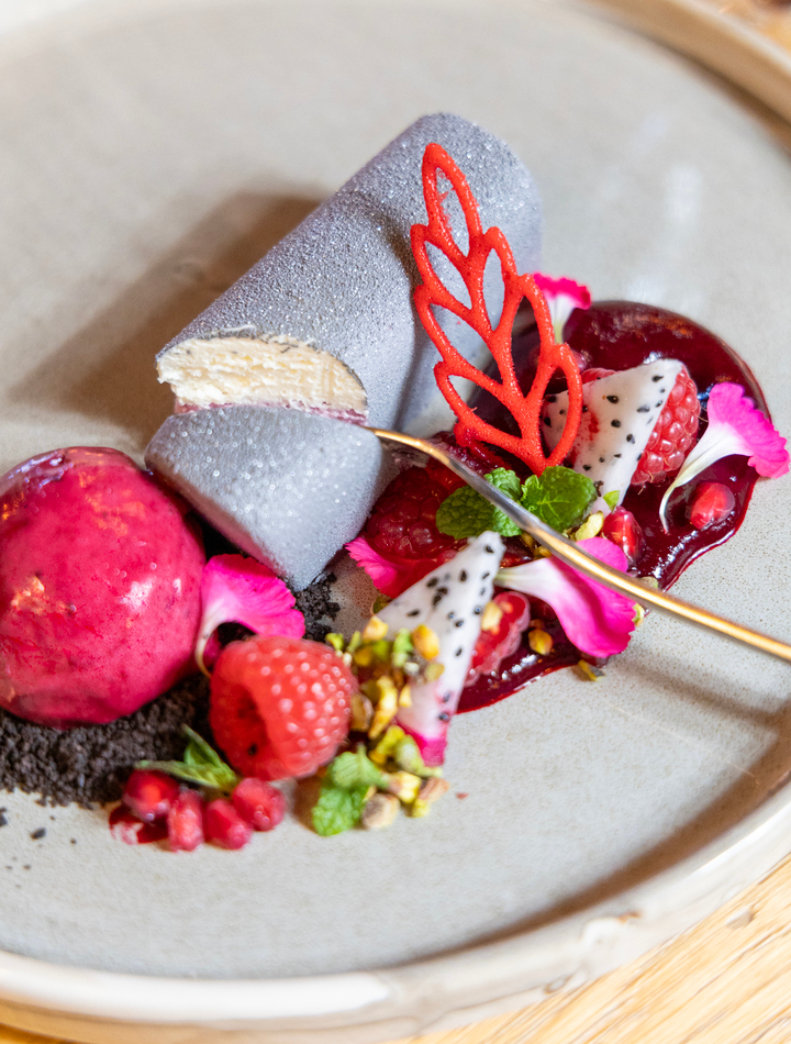 czarny bez z czekoladą, sorbet z czarnej porzeczki, granat, zamsz